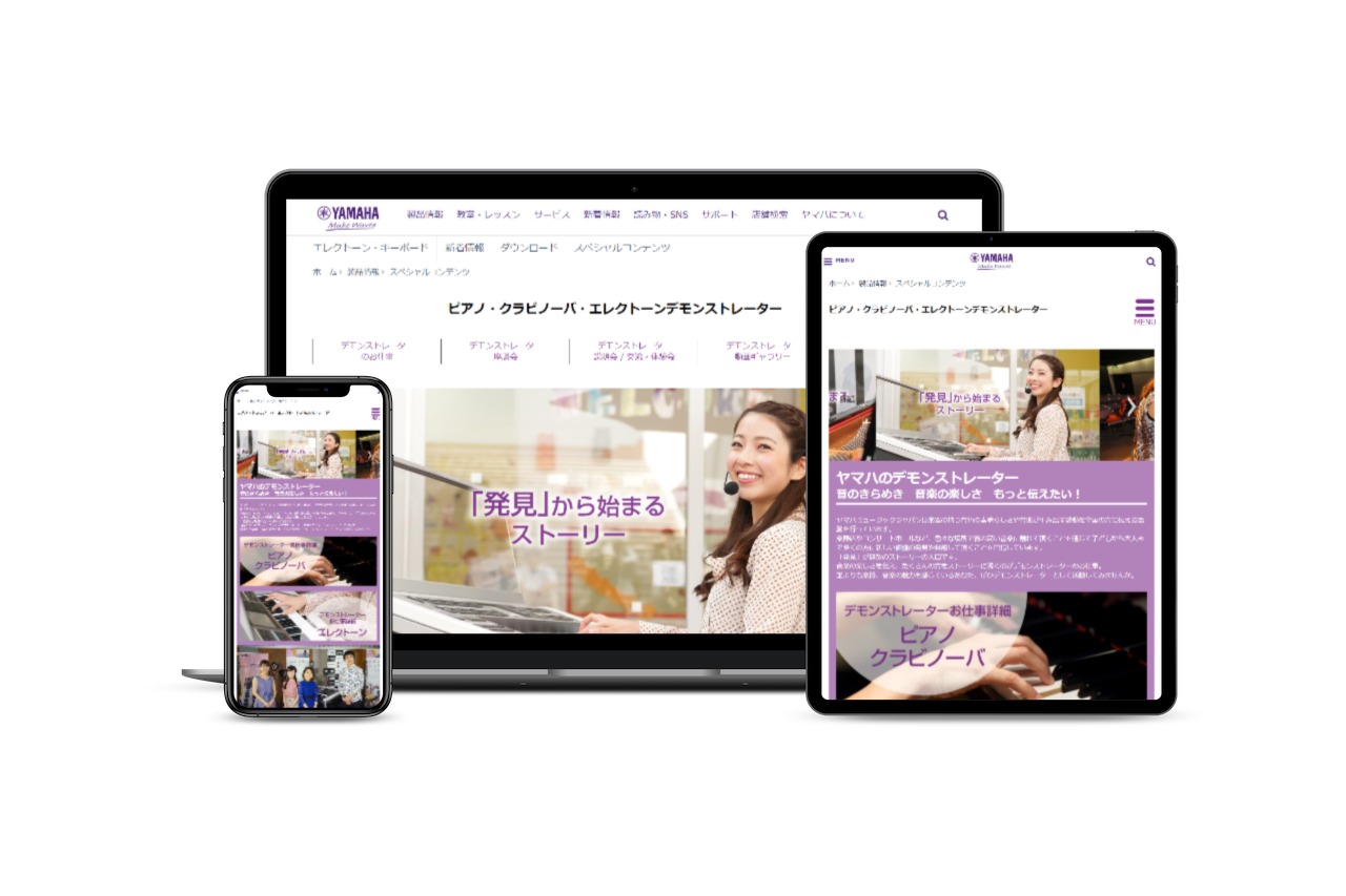 求人広告代理店の制作部門に従事していた際に、楽器製造会社様のピアノ・エレクトーンデモンストレーターの求人募集ホームページを制作いたしました。デザインは社内のデザイナーと分担し、主にお客様対応とコーディング、SEO対策を担当。制作において、先方指定のサイト構築システム(独自CMS)に苦労いたしました。操作の不慣れや世界各所からのアクセスによる更新待ち渋滞などです。